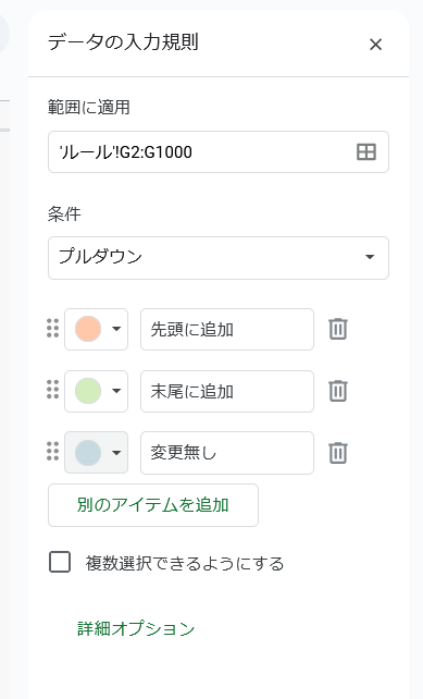 - E列(条件:添付ファイル): E2から下のセルを選択し、「データ」>「データの入力規則」>「ルールを追加」と進みます。「条件」で「プルダウン」を選び、「オプション1」に