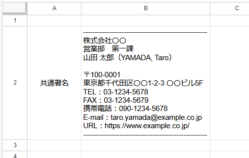 最後に、シート左下の「+」(シートを追加)ボタンで新しいシートを追加し、名前を「設定」に変更します。 そして、以下のように入力してください。ここに入力した署名が、すべての自動返信メールで共通の署名として使われます。
