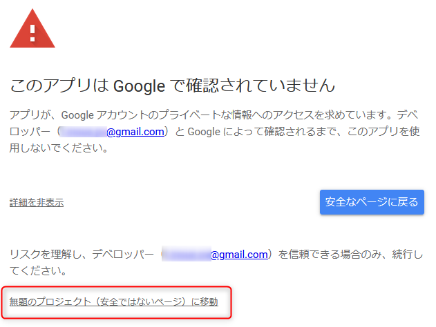 「このアプリはGoogleで確認されていません」という、ちょっと怖い警告画面が表示されます。でも、心配しないでください!これは、あなたが今作ったばかりのプログラムだから表示されるだけで、安全です。左下の「詳細」をクリックしてください。