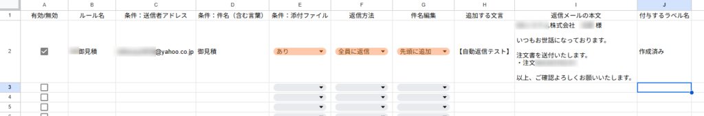 次に、以下の見出しを A1セルからJ1セルにかけて、順番に入力してください。ここが、返信のルールを決める場所になります。